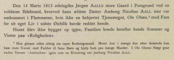 Mens bestemor endnu levet hendte der en begivenhet som for altid satte et tungt merke i tantes liv. De bodde i huset i byen og en nat brød der ut ild og hele huset brendte op. Alle belv reddet men tante Ambor var ikke til at finde. Bestemor vred sine hænder og bad om at man måtte gjøre alt for at redde hende. Endelig var der en modig mand, en tjenestegut der på gården. Han blev altid kadt ”Ola Gut” og var sit herskap meget hengiven. Han klatret op på en høe stige helt op til loftet, og der midt i flammerne, fant han tante, aldeles fortvilet. ”Lad mig brænde, det er min skyld” var alt hva hun sa, men den sterke mand tok hende med magt og bar hende ned.